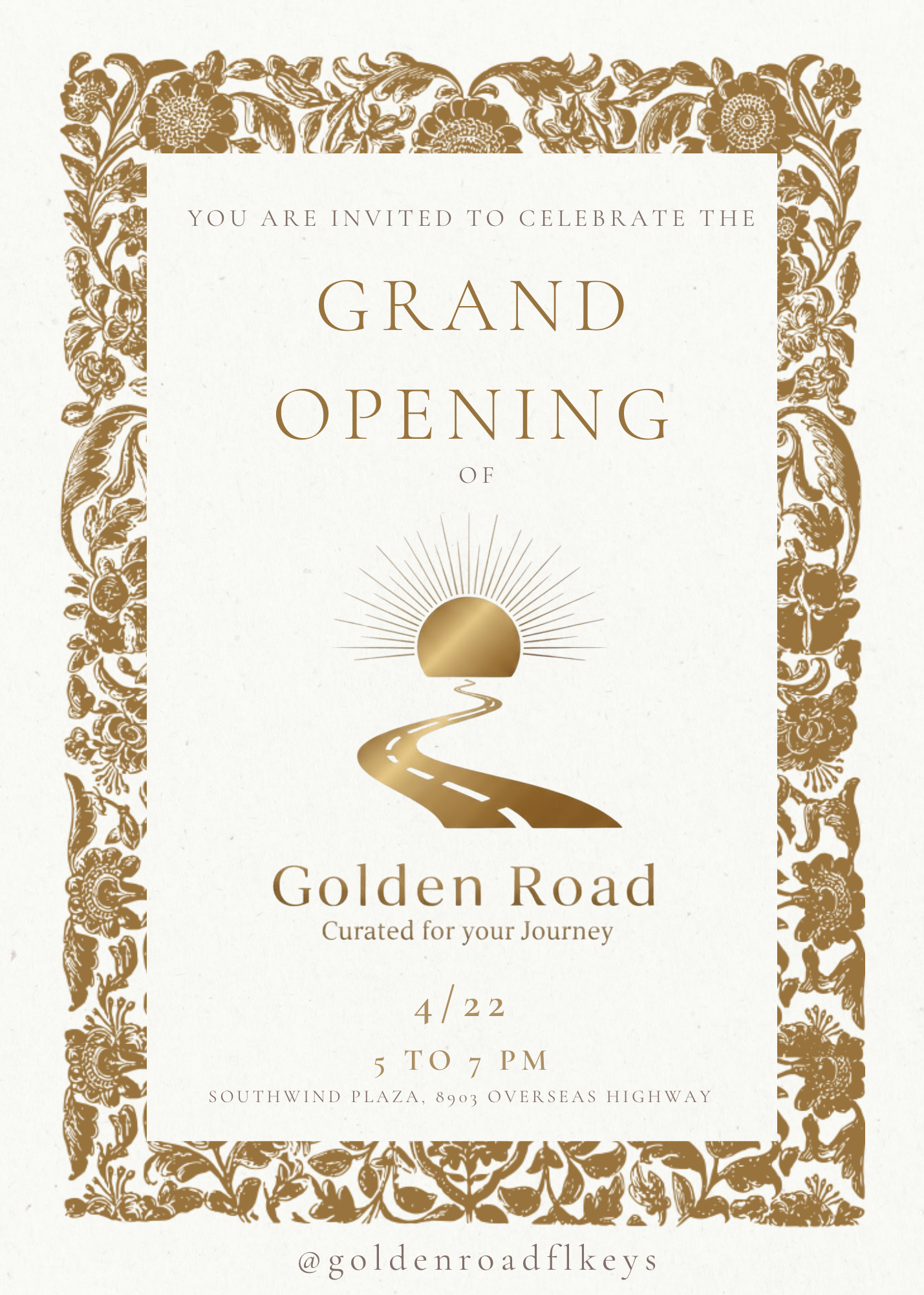 Join us in Marathon, FL for the Grand Opening of Golden Road on April 22, 5–7pm. Celebrate this stylish new boutique with a 6pm ribbon-cutting, complimentary champagne, and beautiful retail items to discover. Perfect for Keys travelers seeking unique finds and island vibes. Meet the owners—perfect stop for Keys visitors.