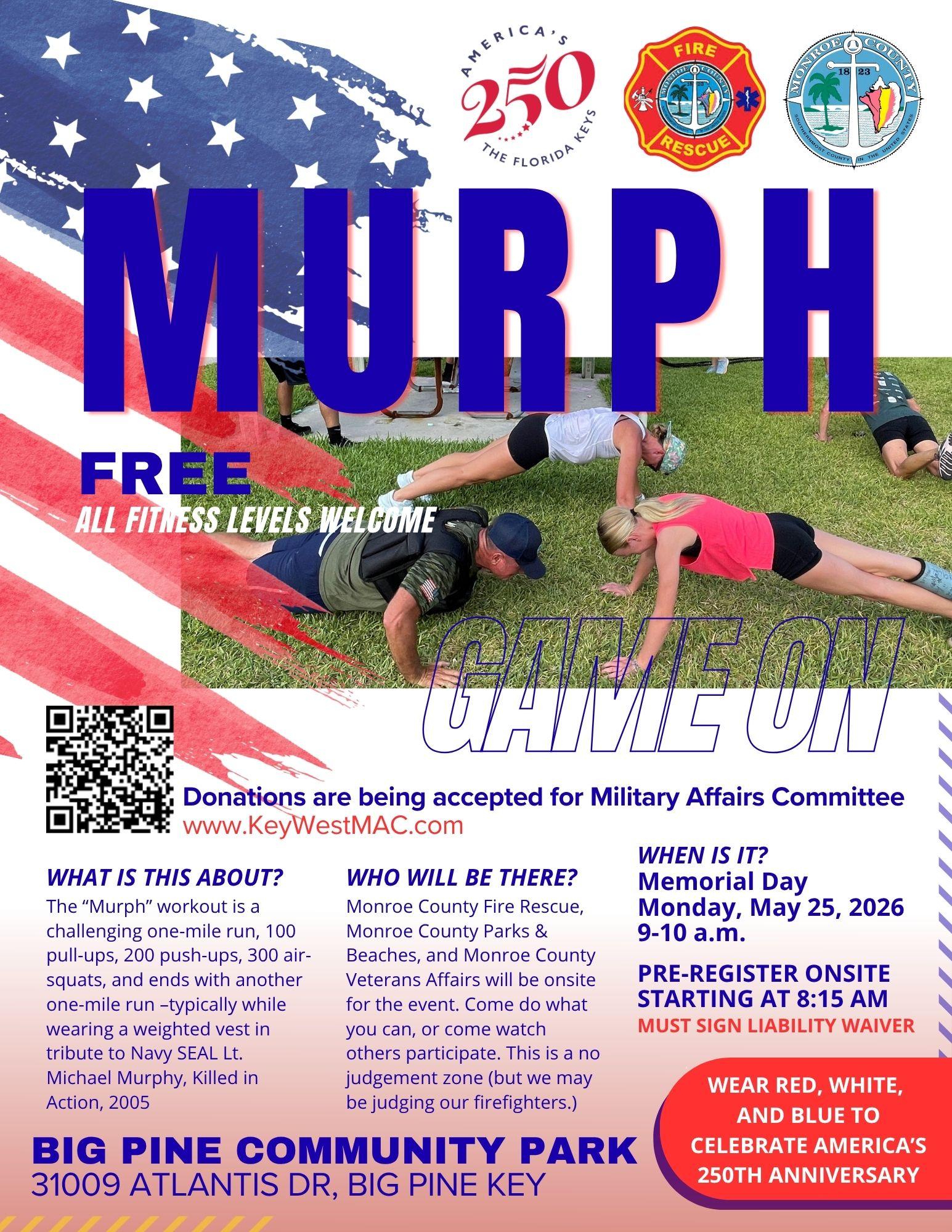 Honor Memorial Day with the Murph Challenge, a community fitness event open to all levels taking place at Big Pine Community Park in Big Pine Key. This challenging workout includes a one-mile run, pull-ups, push-ups, squats, and another one-mile run, completed with or without a weighted vest, in tribute to Navy SEAL Lt. Michael Murphy. Hosted in partnership with local organizations including Monroe County Fire Rescue, the event welcomes participants to join in a supportive, judgment-free environment while celebrating community, service, and America’s 250th anniversary. Donations will benefit the Military Affairs Committee, and attendees are encouraged to wear red, white, and blue.